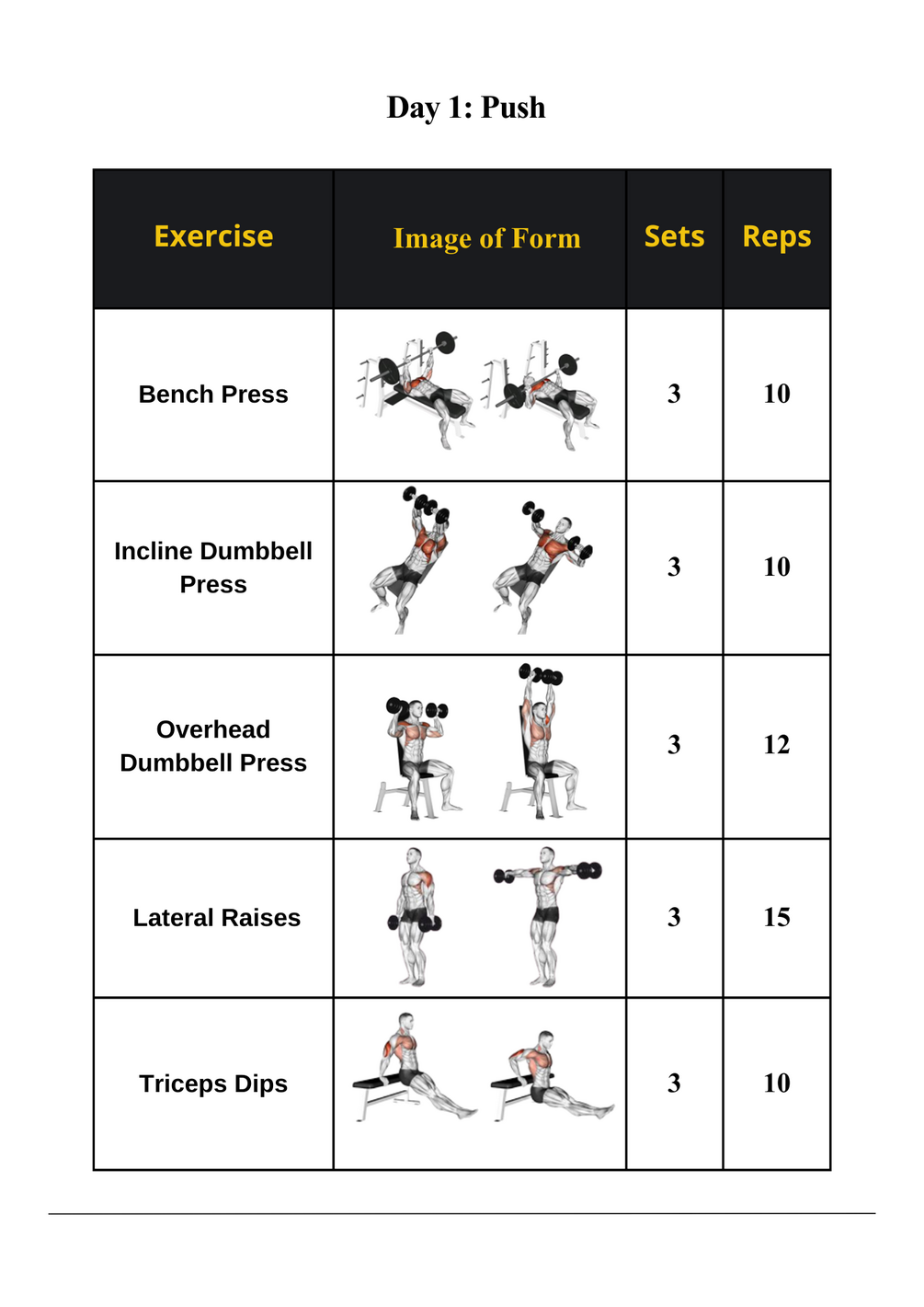 You’ll get a 30+ page beginner‑friendly eBook with a clear 4‑week (30‑day) gym plan based on a 5‑day split (Push/Pull/Legs/Upper/Lower), plus exercise tutorials with form images and a basic nutrition + meal planning guide to support fat loss and muscle gain.